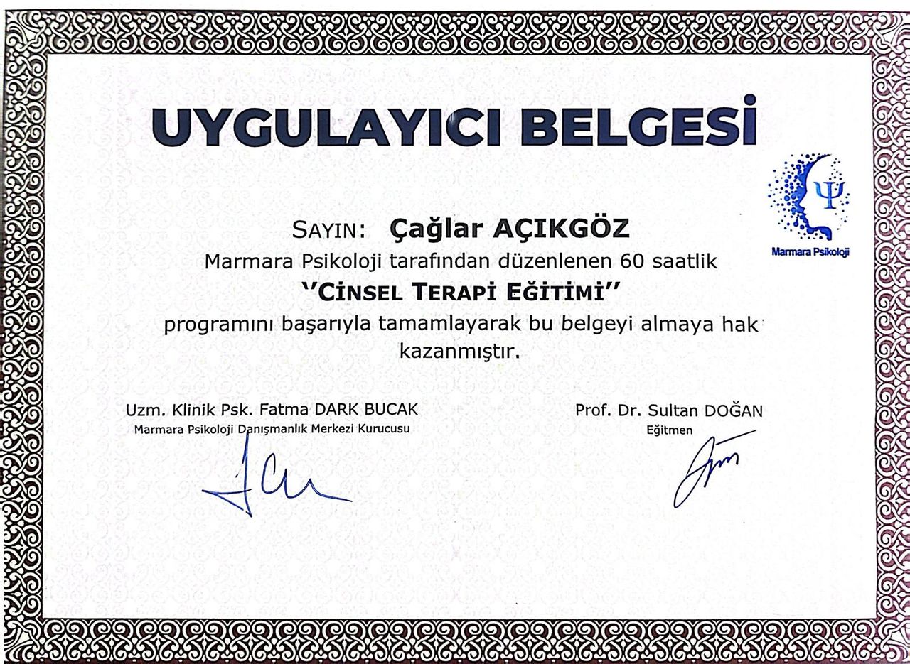 Uzm.Dr. Çağlar Açıkgöz, Gazi Üniversitesi Tıp Fakültesi'nden 1995 yılında mezun olmuştur. Ankara Numune Eğitim ve Araştırma Hastanesi Psikiyatri Anabilim Dalı'nda 2001 yılında uzmanlığını tamamlamıştır. Ankara Eğitim ve Araştırma Hastanesi Psikiyatri Kliniğinde 2,5 yıl psikiyatri uzmanı olarak çalıştıktan sonra Ankara Numune Eğitim ve Araştırma Hastanesi’nde AMATEM (Alkol ve Madde Bağımlılığı Merkezi)’nin Kurucu hekimi ve Başhekim yardımcılığı ile Yetişkin katı Sorumlu hekimliğini yapmıştır. Polatlı Dua Tepe Devlet Hastanesinde psikiyatri hekimi olarak görev yaptıktan sonra Ankara Sincan Dr. Nafiz Körez Devlet Hastanesinde Psikiyatri Servisinin ve TRSM(Toplum Ruh Sağlığı Merkezi)’ nin kurucu ve sorumlu hekimliğini yapmıştır. Aydın Devlet Hastanesi Psikiyatri Kliniğinde Psikiyatri Uzmanı olarak çalışmış ve başhekim yardımcılığı yapmıştır. Burada da TRSM(Toplum Ruh Sağlığı Merkezinin) kuruculuğu yapmıştır. Uzmanlığı boyunca pek çok Yerli ve Uluslararası-çok merkezli ilaç çalışmaları ve Klinik Araştırmalarda bulunmuştur. Aldığı eğitimler arasında Bilişsel-Davranışçı Terapi-Uyku bozuklukları- Grup Terapileri- Krize Müdahale Terapileri- Alkol ve Madde Bağımlılığı Terapileri-Psikotik Hastalıklarla Başetme Terapileri-Cinsel İşlev Bozuklukları Terapileri bulunmaktadır. Halen kendi özel muayenehanesinde hastalarına hizmet vermektedir.